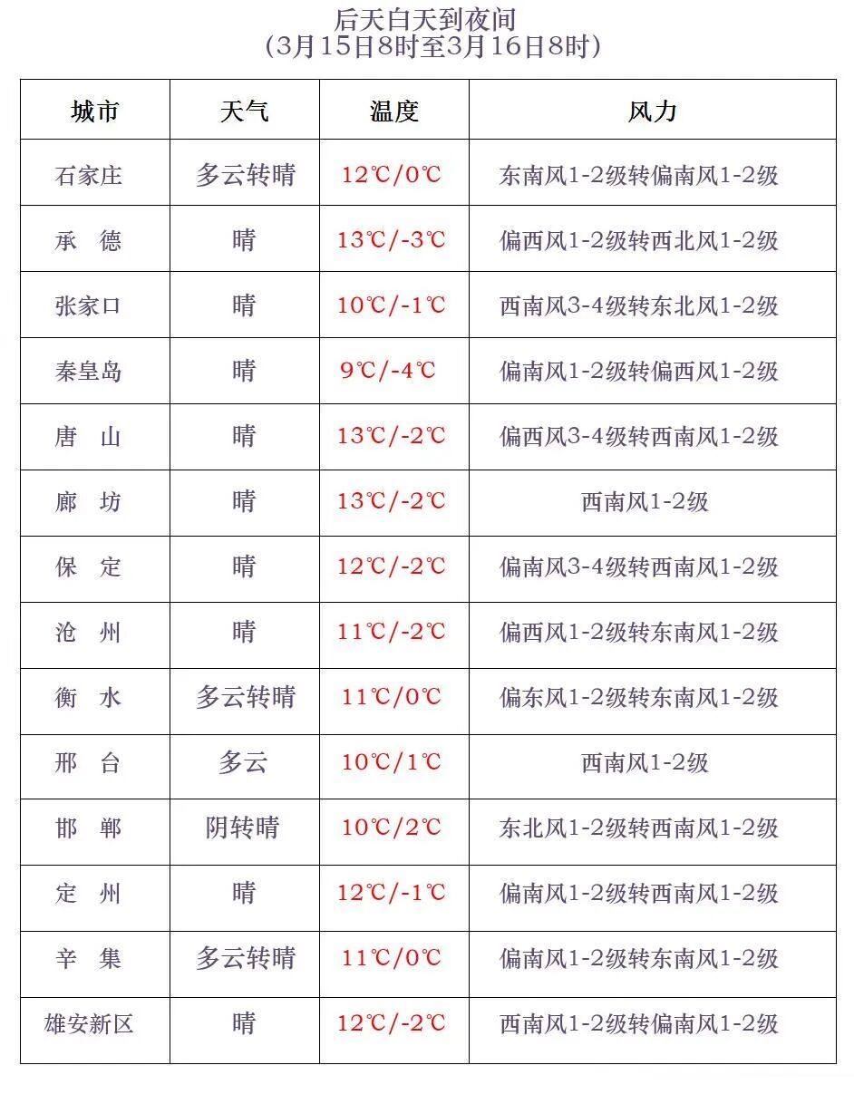 明天夜间到15日,石家庄西部、衡水南部、邢台、邯郸阴有小雨或雨夹雪转多云,其他地区晴间多云。