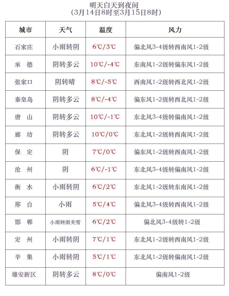 明天白天,保定、石家庄、邢台、邯郸四个地区的西部山区阴有小雪或雨夹雪,局地有中雪,沧州、衡水、邢台、邯郸四个地区的东部阴有小雨转雨夹雪,保定、廊坊以南的其他地区阴有小雨或零星小雨,其他地区阴转多云。