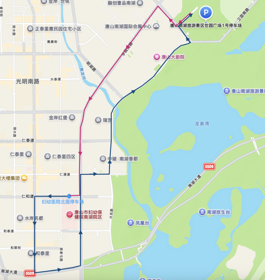 路线(蓝线):妇幼医院北停车场→仁和道→学院南路→艺文道→世园广场停车场指定地点