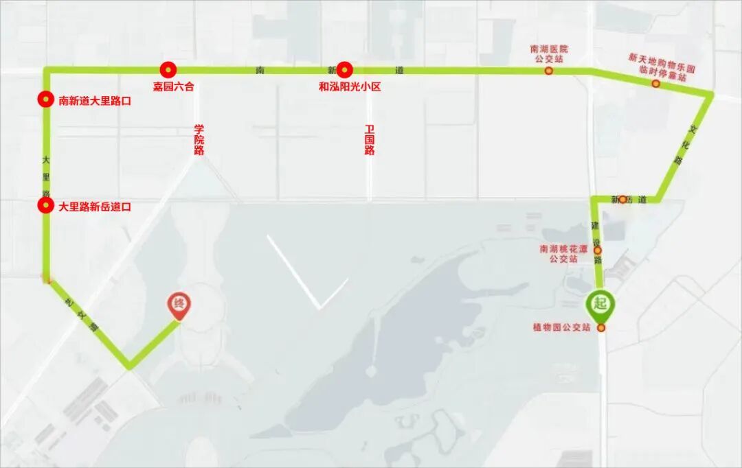 路线:植物园公交站(南湖美食广场停车场)→南湖桃花潭公交站(影视基地停车场)→新天地购物乐园临时停车点→南湖医院公交站(新天地购物乐园、美泰家世界)→和泓阳光小区→嘉园六合小区→南新道大里路口→大里路新岳道口→演出场馆(世园广场临时停车场指定地点)。