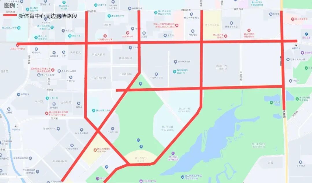 路线:唐山站西广场→竹安路→国防道→站前路→南新道→大里路→艺文道→内部路与艺文道交口→演出场馆(世园广场临时停车场指定地点)