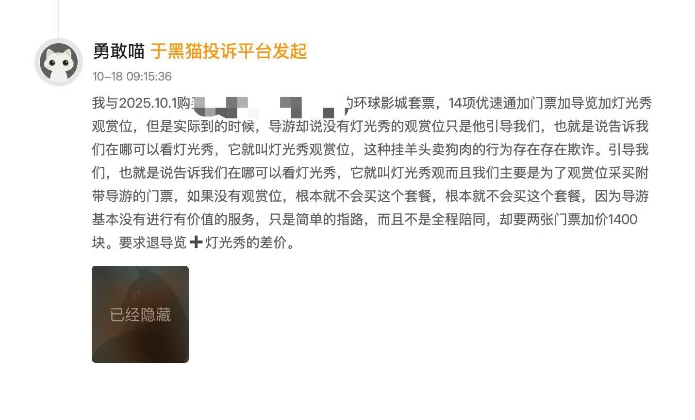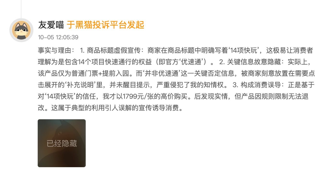 记者在黑猫投诉平台搜索看到,类似消费投诉还有不少。福建的黄先生在某平台购买了2张10月5日的环球影城套票,其中包含门票+提前入园+14项快玩+管家。每张价格为1799元。