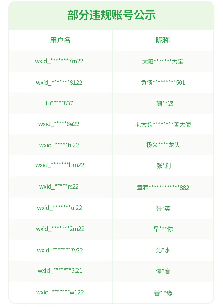 上述行为一经发现核实,平台将依据国家相关法律法规以及《腾讯微信软件许可及服务协议》《微信个人账号使用规范》等平台协议及规则,视违规严重程度对相关账号进行阶梯式处理,多次违规者有可能永久限制登录,对确认违规的微信群,进行停用群功能处理。