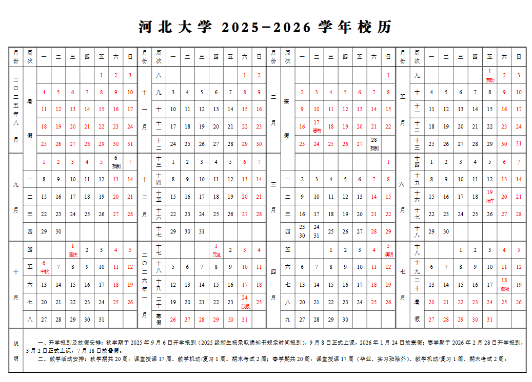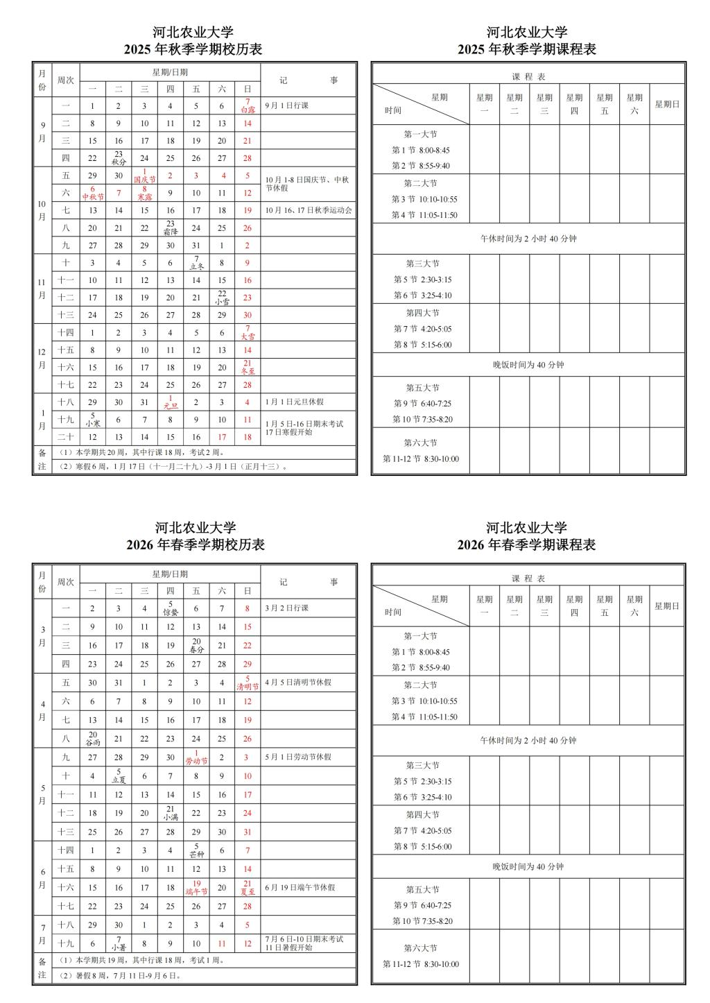 2026年1月24日放寒假,春学期于2026年2月28日开学报到,3月2日正式上课。