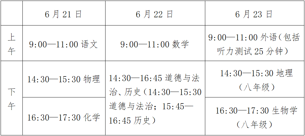 (3)考试形式。根据各学科课程特点,分类采取不同的考试方式:语文、数学、外语(含听力测试)、物理书面笔试、化学书面笔试为全闭卷形式;道德与法治、历史为全开卷形式,采用合场分卷的形式进行考试,考试总时长为135分钟,每科各60分钟,中场换卷15分钟。各科考试均在答题卡上作答。其中,选择题要求考生用2B铅笔将答案填涂在答题卡上,非选择题要求考生用黑色字迹的签字笔将答案书写在答题卡上。