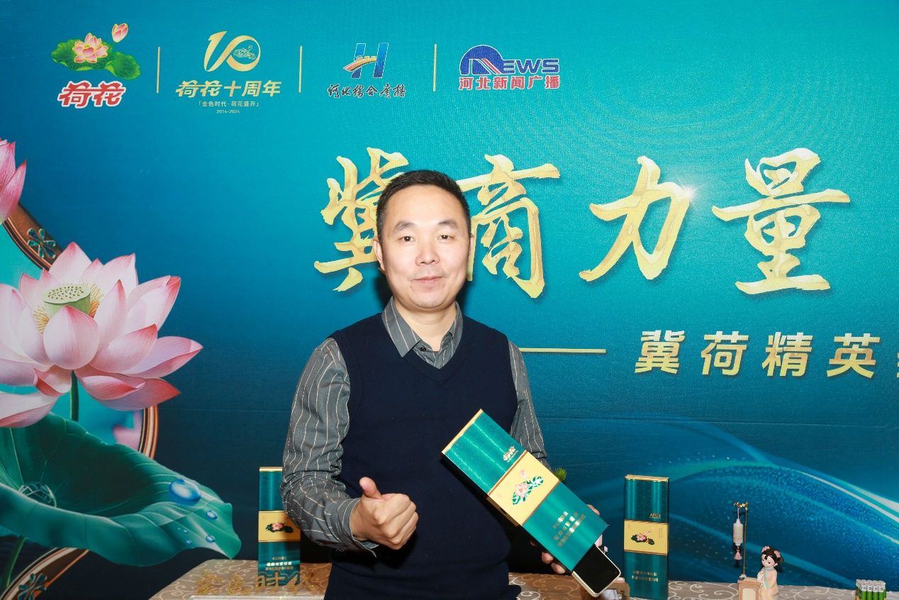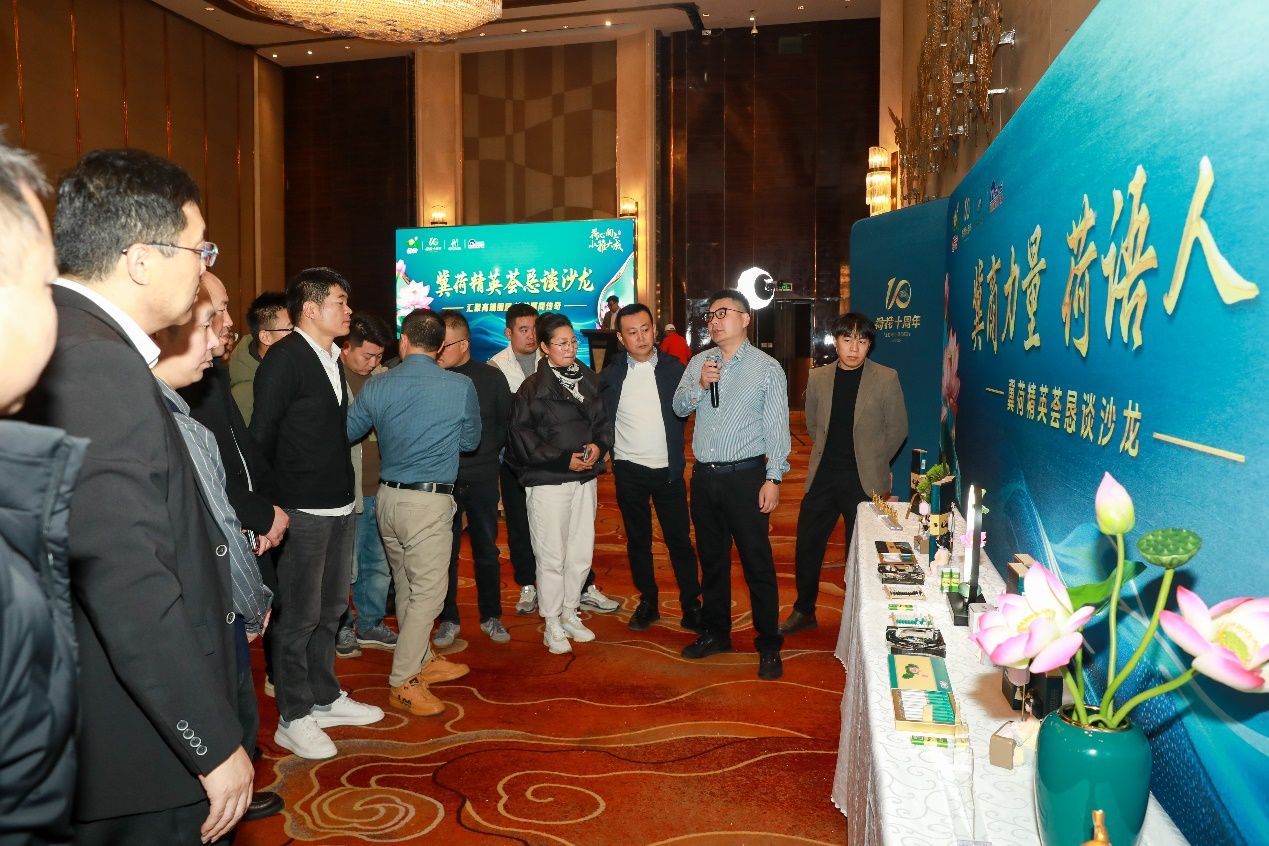 在“冀荷精英荟恳谈沙龙”活动现场,河北中烟华东销区经理徐卫友在荷花展台前为与会企业家介绍荷花品牌文化。
