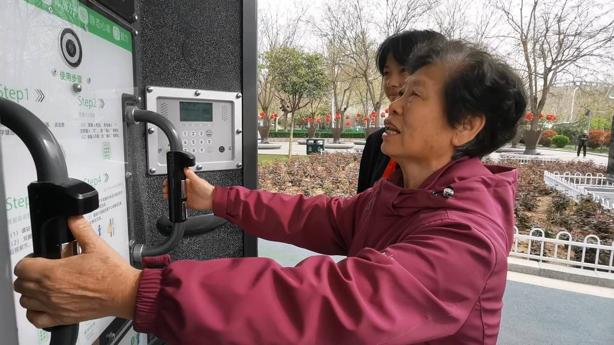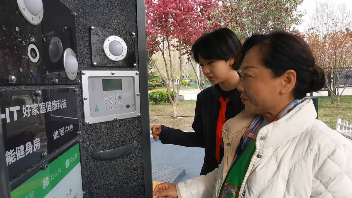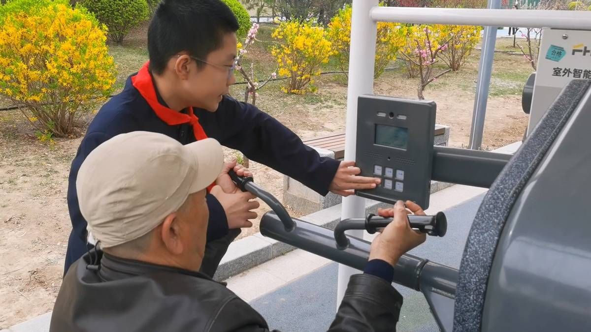 有些老年人不熟悉智能健身设施如何使用,同学们还当起了志愿者。