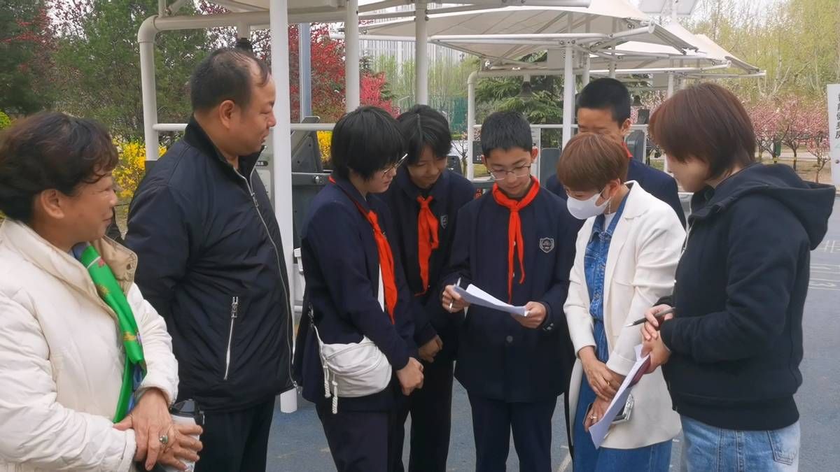 同学们分为多个小组展开调研。他们彬彬有礼、落落大方地向公园游客发放问卷、询问智能健身设施的使用感受。问卷内容涵盖设施使用频率、便捷性、功能性、遇到的问题及改进建议等方面。