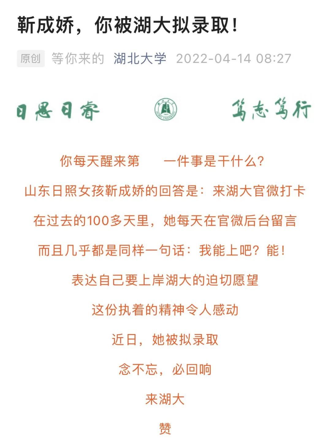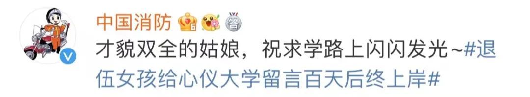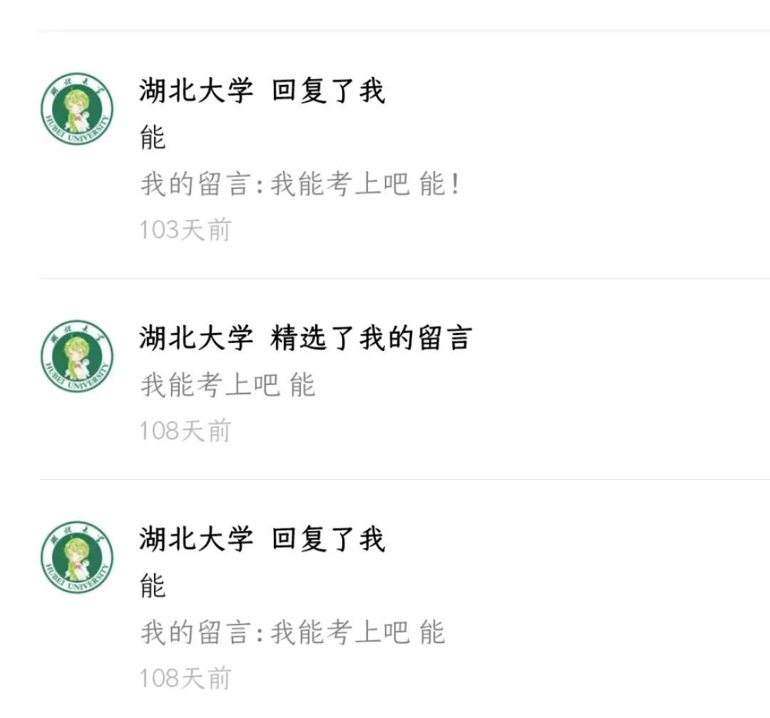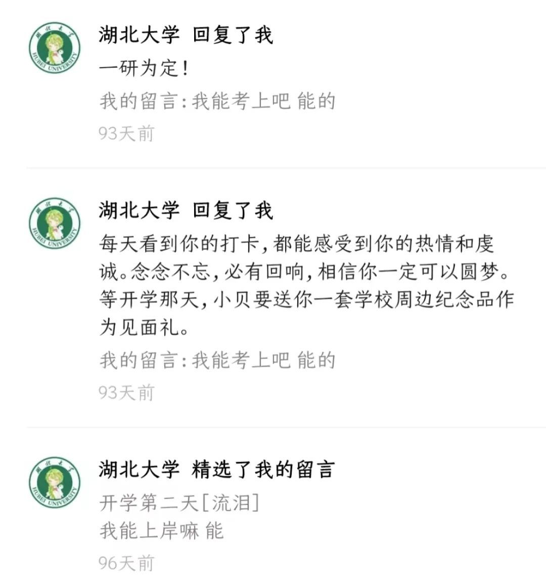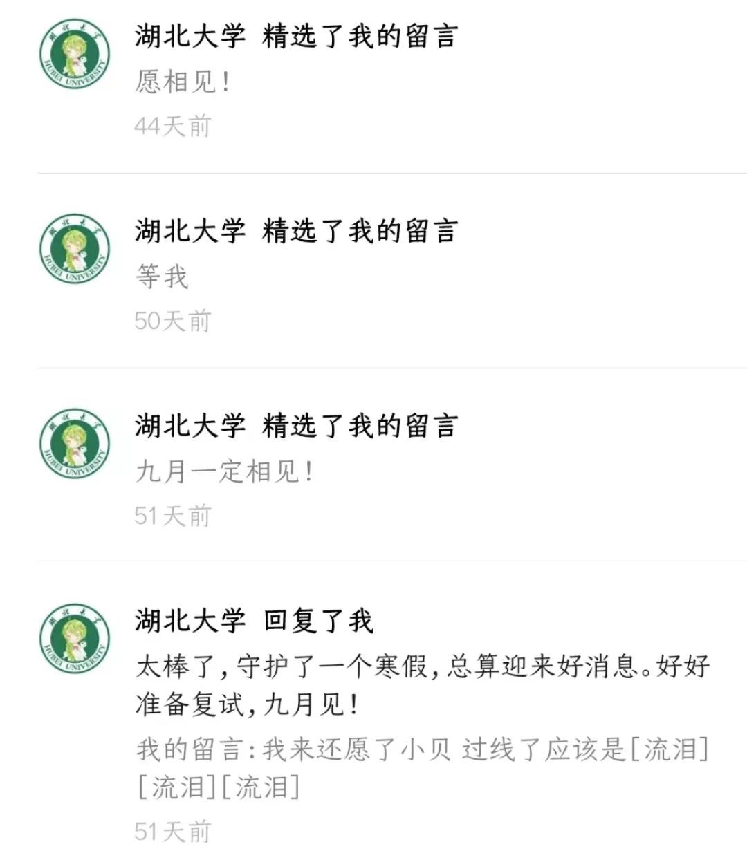 学校官微团队也很快注意到这个每天来留言的铁粉,真诚鼓励她。 初试成绩出来前一天,学校官微回复 “明天就要出分了,相信你一定可以在这还愿喔”;初试结果公布后,学校又回 “太棒了!守护了一个寒假,总算迎来了喜讯!准备复试,九月见!”