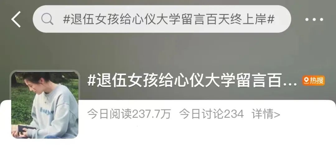 在部队的两年时间里,靳成娇刻苦训练,多项成绩考核优秀,还获评“优秀新兵”。 服役两年后,靳成娇回归校园。她坚持在学业上也努力提升自己,连年拿到奖学金。为了继续深造, 她在2021年选择考研。 和大多数考研人一样,靳成娇的考研之路也充满着焦虑、迷茫。但靳成娇坦言, 在部队里的意志力训练,对她考研帮助巨大。 一次,她在学校官微评论区留言:“我能考上吧?”,令她惊喜的是,学校也贴心地回复了一个 “能”字。随后, 她坚持打卡近100天......