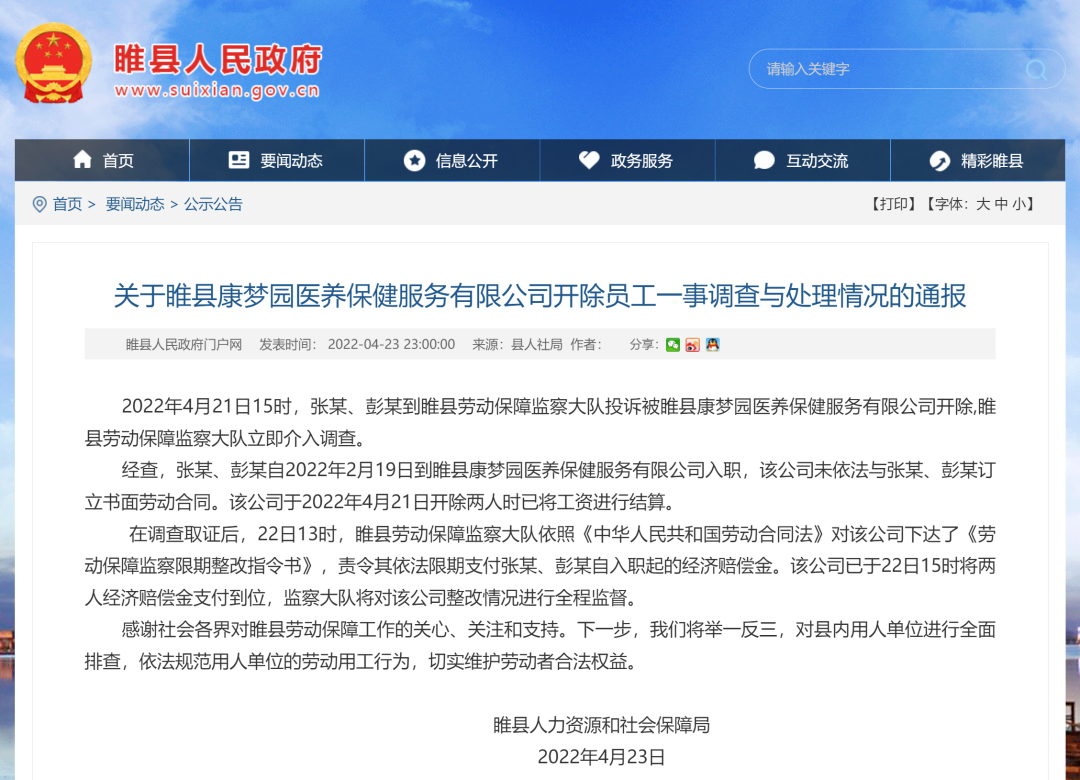 23日夜间,睢县人力资源和社会保障局发布《关于睢县康梦园医养保健服务有限公司开除员工一事调查与处理情况的通报》: