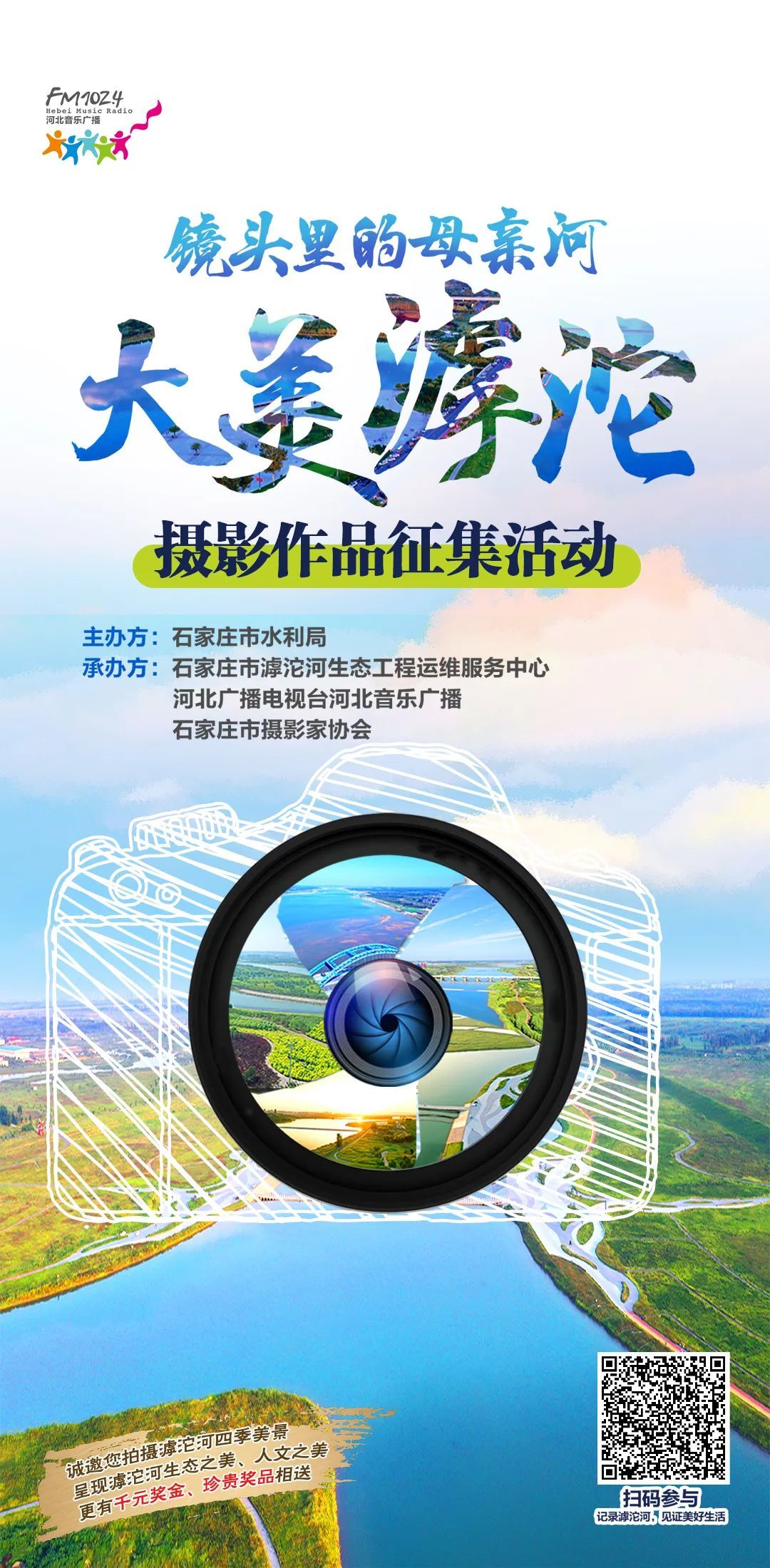 本次“镜头里的母亲河·大美滹沱”摄影作品征集活动,通过征集广大市民和摄影爱好者拍摄的滹沱河照片和视频,集中展示滹沱河流经石家庄109公里“一城七县”的全域全季美景。启动仪式上,主办方、承办方8位启动嘉宾,将各自手中代表不同河段的一瓶滹沱河水倒入启动台内,寓意通过本次摄影征集活动,汇聚滹沱河全域美景,形成合力、华彩绽放!