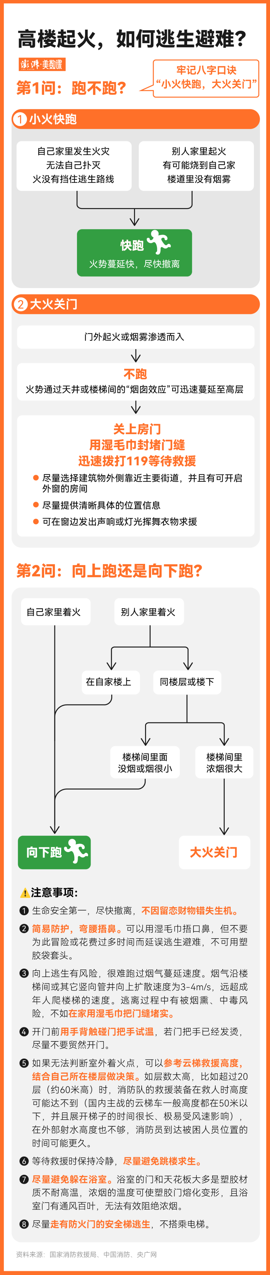 有建筑从业者建议,要攻克高层住宅的消防及救援难题,要从多方面入手:超百米建筑外墙保温材料需用A级不燃材料;设置防火墙、防火分隔,划分独立防火分区;配备专用避难层/避难间,兼具隔热隔烟、应急联络功能:设计独立防排烟系统,快速排出烟气;楼梯间、前室设加压送风,阻断烟气侵入逃生通道;配备足量消防栓、喷淋等措施,搭建高层独立消防供水系统。高楼起火,牢记八字口诀:小火快跑、大火关门。(请上下滑动查看图片)