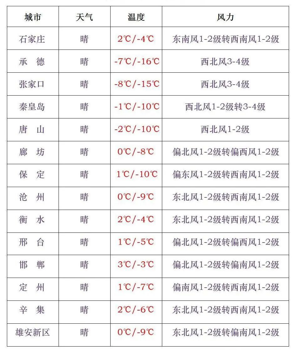 【寒潮黄色预警】今天(12月2日)早晨,张家口、承德最低气温继续下降6~10℃,其他地区下降2~5℃。最低气温张家口北部、承德北部降至-30~-19℃,保定、廊坊以南地区降至-9~-1℃,其他地区降至-18~-10℃。石家庄晴,-4~2°C;雄安新区晴,-9~0°C;北京多云转晴,-3~11°C。