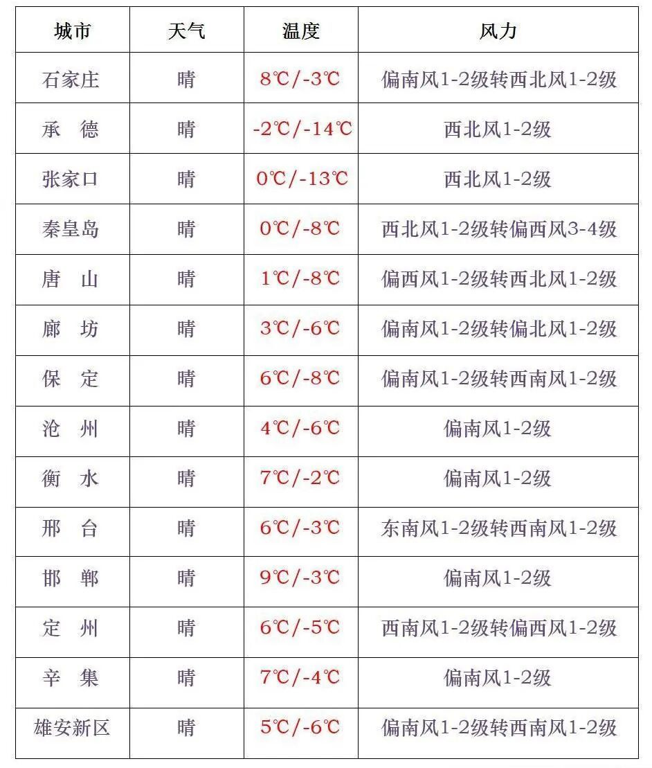 【河北寒潮持续发力】今天(12月3日)白天,全省晴,今天夜间到4日,渤海海域和沿海地区有偏西风转西北风5到6级,阵风7到8级,张承地区昼夜温差可达10℃以上。石家庄晴,-3~8°C;雄安新区晴,-6~5°C;北京多云转晴,-6~2°C。