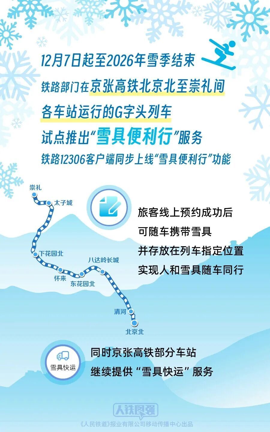 【京张高铁“雪具便利行”】12月7日起至2026年雪季结束,铁路部门在京张高铁北京北至崇礼间各车站运行的G字头列车试点推出“雪具便利行”服务,实现人和雪具随车同行。