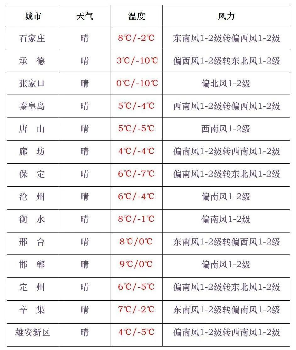 【新的一周河北降温】今天(12月8日)白天,全省晴间多云,今天起河北大部地区最低气温下降,北部和南部地区最低气温下降4~6℃,其他地区下降2~4℃。石家庄晴,-2~8°C;雄安新区晴,-5~4°C;北京晴,-4~4°C。