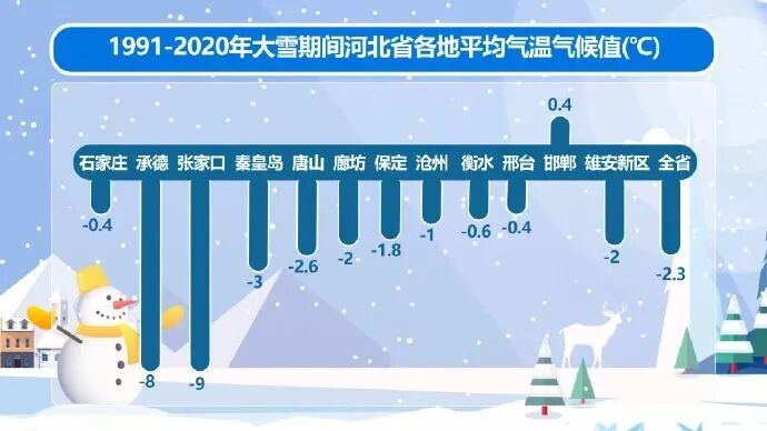 从1991年到2020年三十年气象资料来看,大雪时节,河北全省平均气温为-2.3℃,较上个节气小雪的平均气温(0.4℃)下降了2.7℃,平均最低气温-6.6℃,平均最高气温3.5℃。1991到2020年大雪期间,全省平均累积降水量仅有1.4mm。