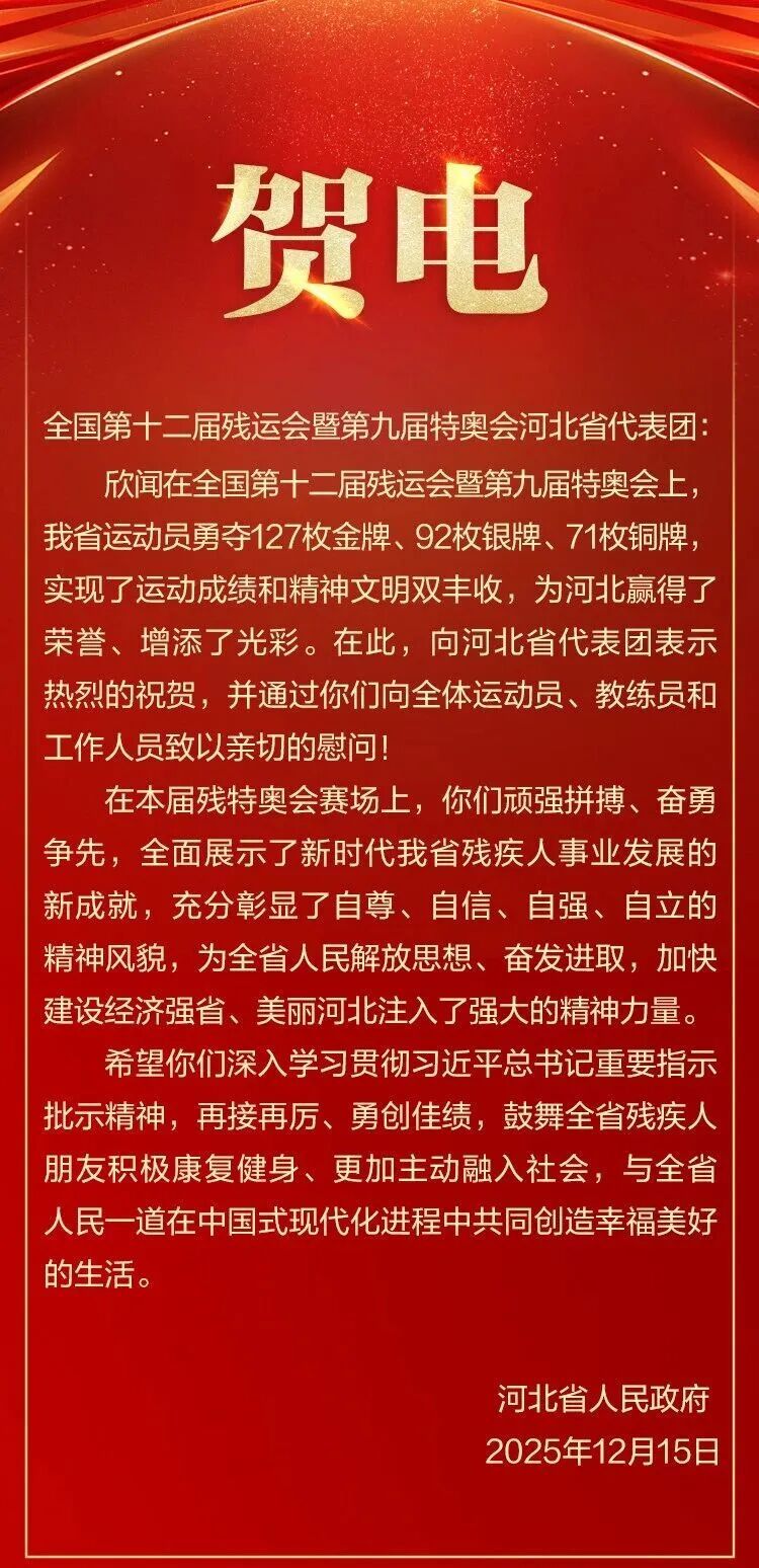 【贺电】河北省人民政府向全国第十二届残运会暨第九届特奥会河北省代表团致贺电。