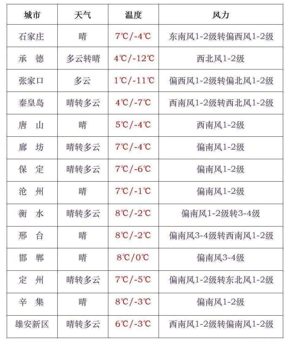 【沿海地区风力较大】未来两天我省大部分地区以晴到多云天气为主,其中沿海地区风力较大。石家庄晴,-4~7°C;雄安新区晴转多云,-3~6°C;北京晴转多云,-4~5°C。