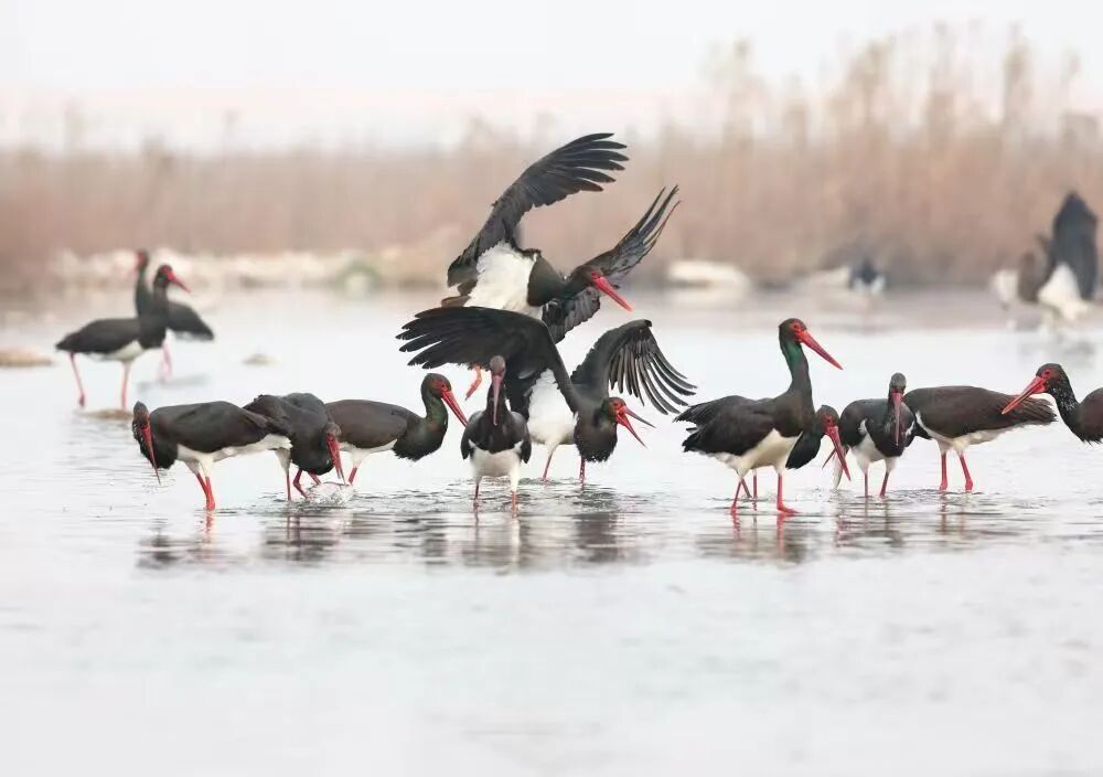 新华社12月20日关注河北井陉:黑鹳栖息绵蔓河。