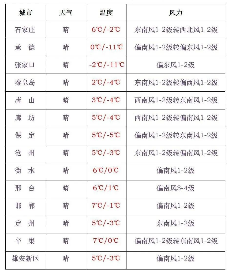 【冷空气来袭】今天(12月21日)白天,全省晴间多云,河北大部气温下降。下周,保定、廊坊以北地区阴有小雪,沧州东部、衡水、邢台东部、邯郸东部地区阴有雨夹雪或小雨。石家庄晴,-2~6°C;雄安新区晴,-3~5°C;北京晴转多云,-6~3°C。