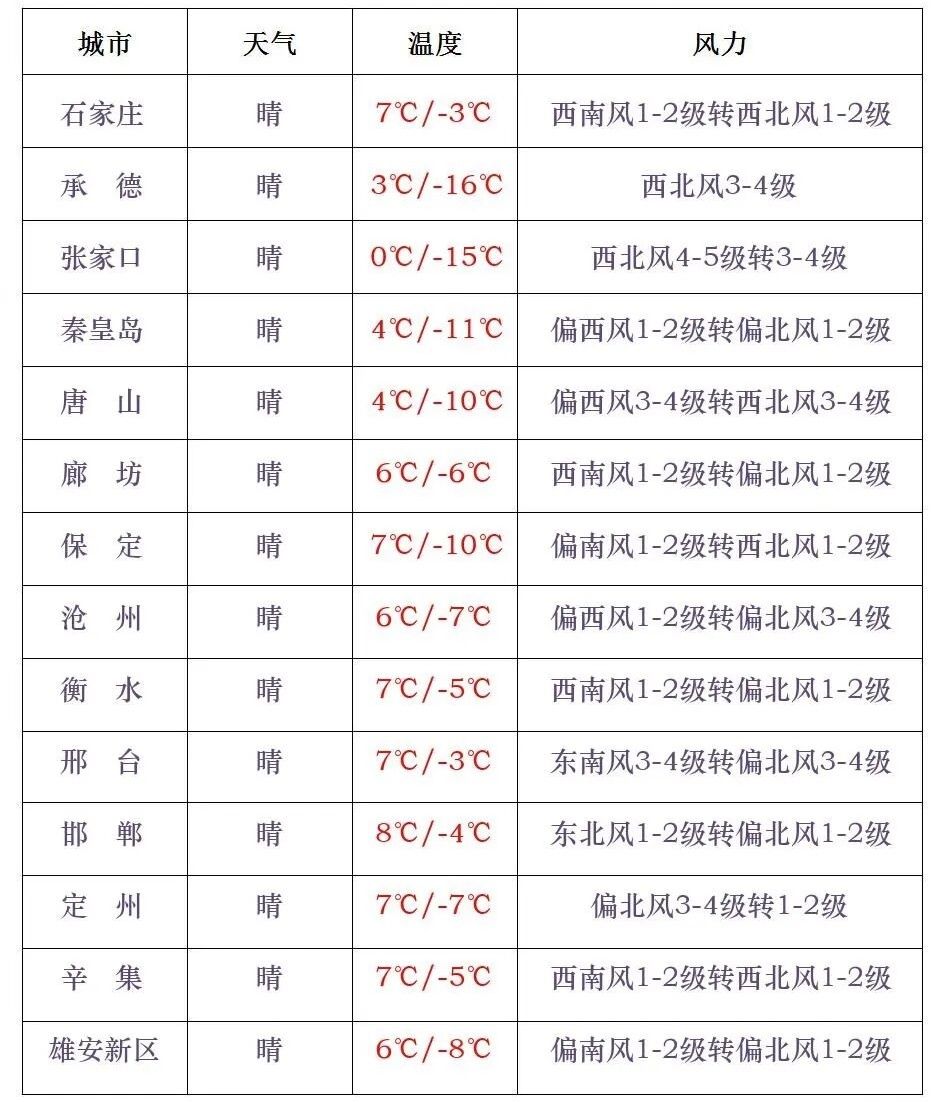 【冷空气发力】今天白天,张家口北部、承德北部多云间晴,其他地区晴间多云。今天夜间到明天,全省晴间多云。今天到明天早晨,我省大部分地区最低气温下降3~6℃,局地下降7~12℃。