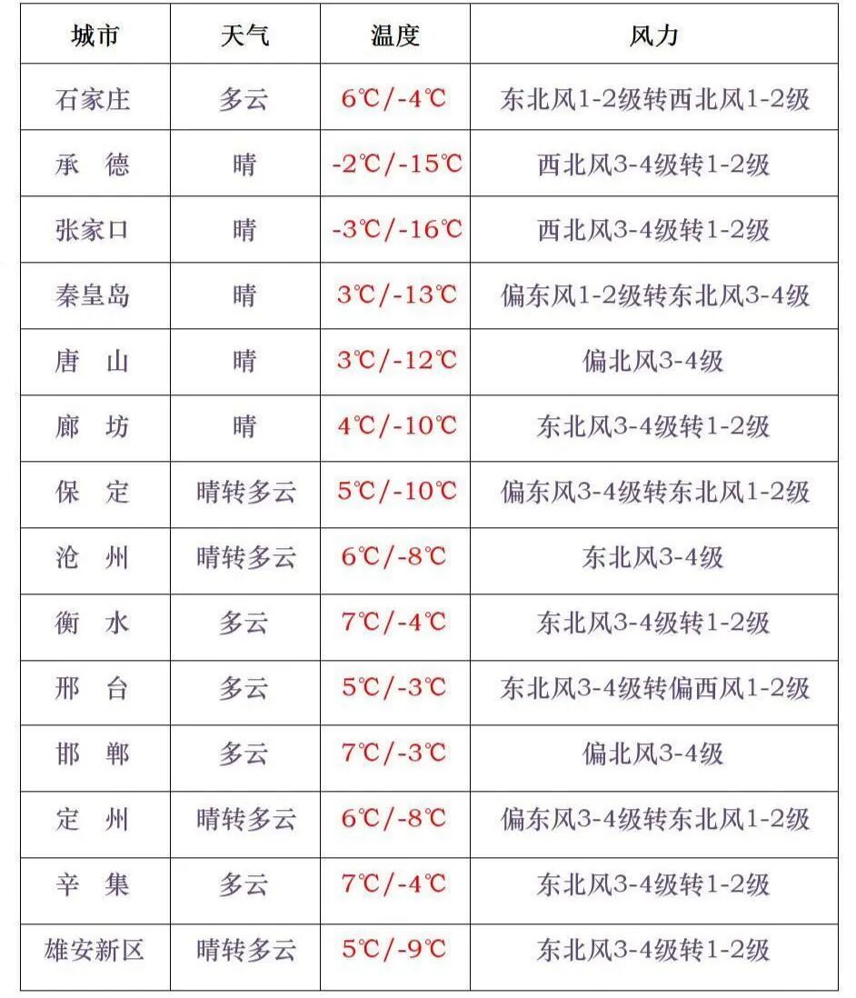 【河北气温下降】今天(12月30日)白天,石家庄、沧州及以南地区晴转多云,其他地区晴间多云。未来两天,受冷空气影响,我省气温将下降,北部地区地面气压梯度增大,风力增强。石家庄多云,-4~6°C;雄安新区多云转晴,-9~5°C;北京晴,-9~3°C。