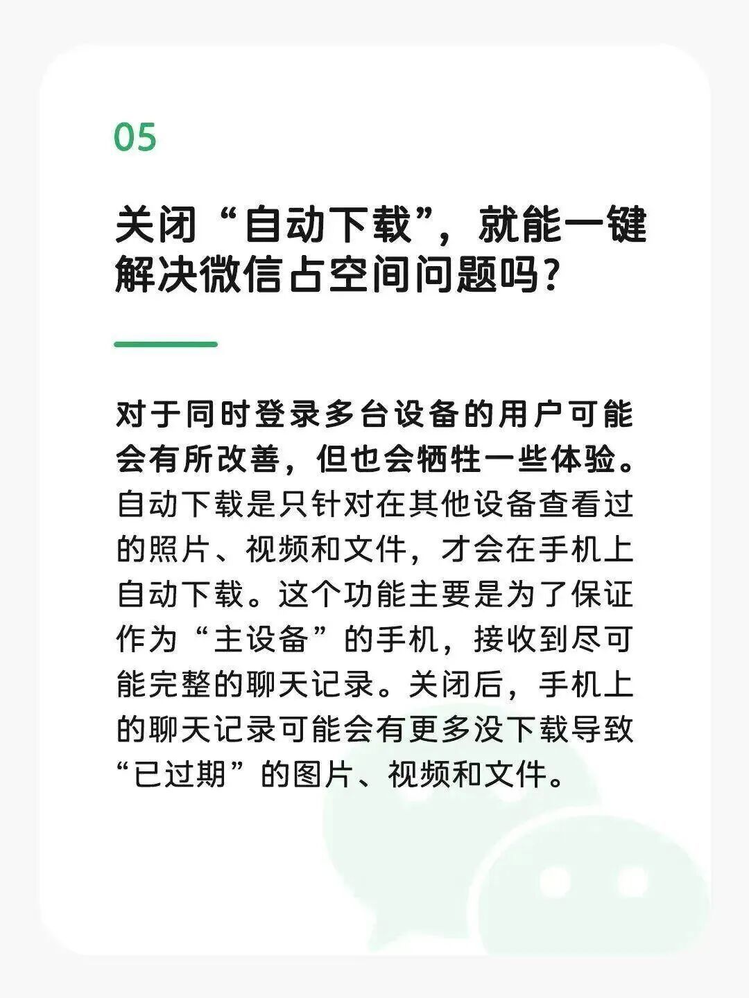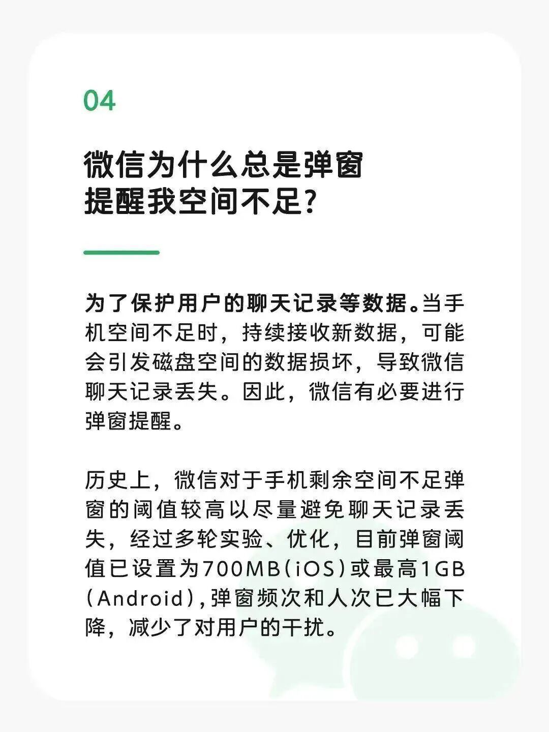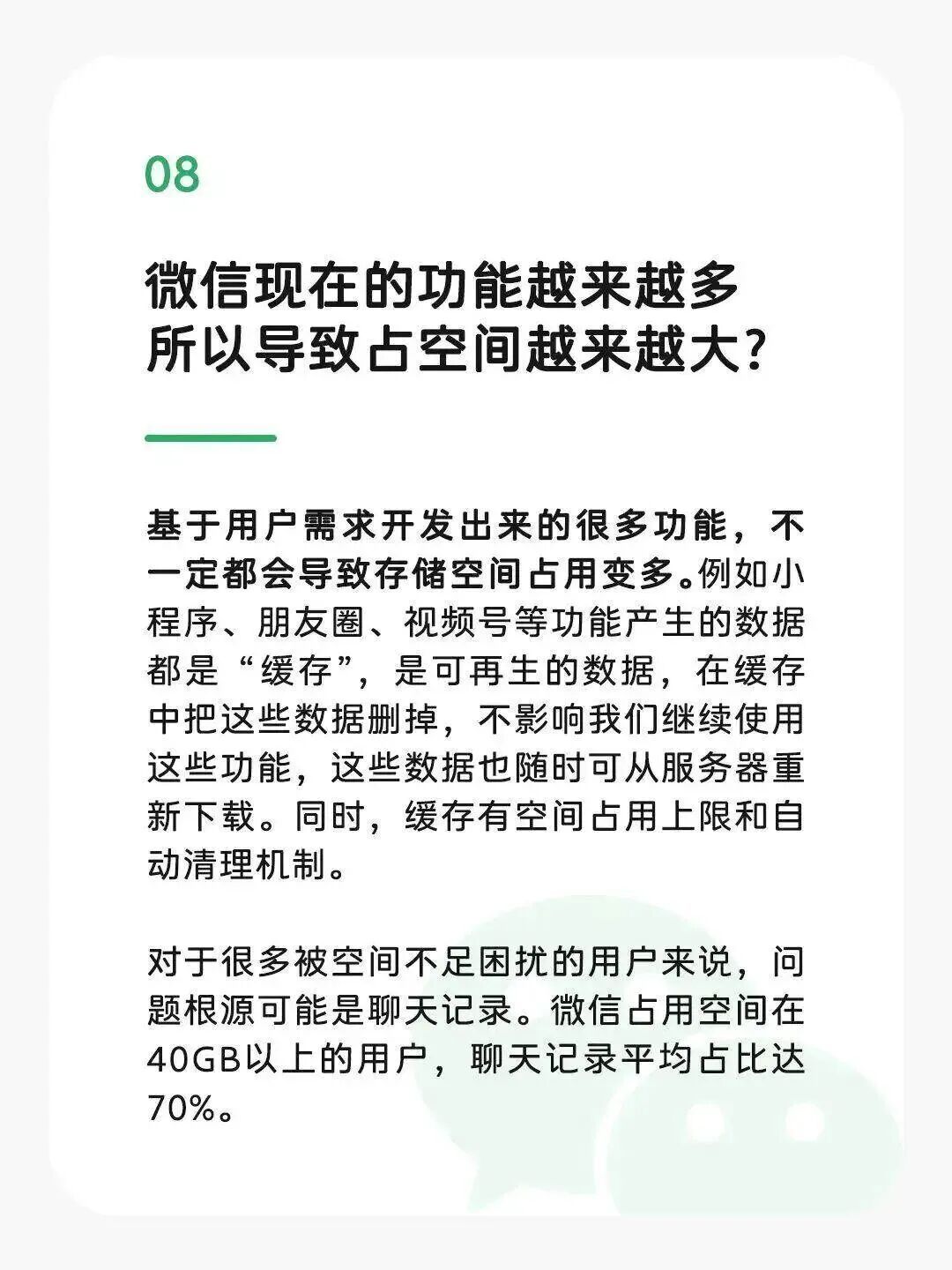 【微信安装包10多年膨胀数百倍】针对微信安装包10多年来膨胀几百倍,微信官方12月29日回应,呼应用户需求,微信提供了越来越更丰富的功能,它需要包含的代码、逻辑及资源会让安装包体积增长,但安装包并不会无限增长,且微信在持续优化,最近的安卓版微信,安装包体积在持续下降。此外,微信方面表示,空间不足问题的根源可能是聊天记录,微信占用空间在40GB以上的用户,聊天记录平均占比达70%。微信回应关于“微信占存储空间”的几个误解>> (请左右滑动查看图片)