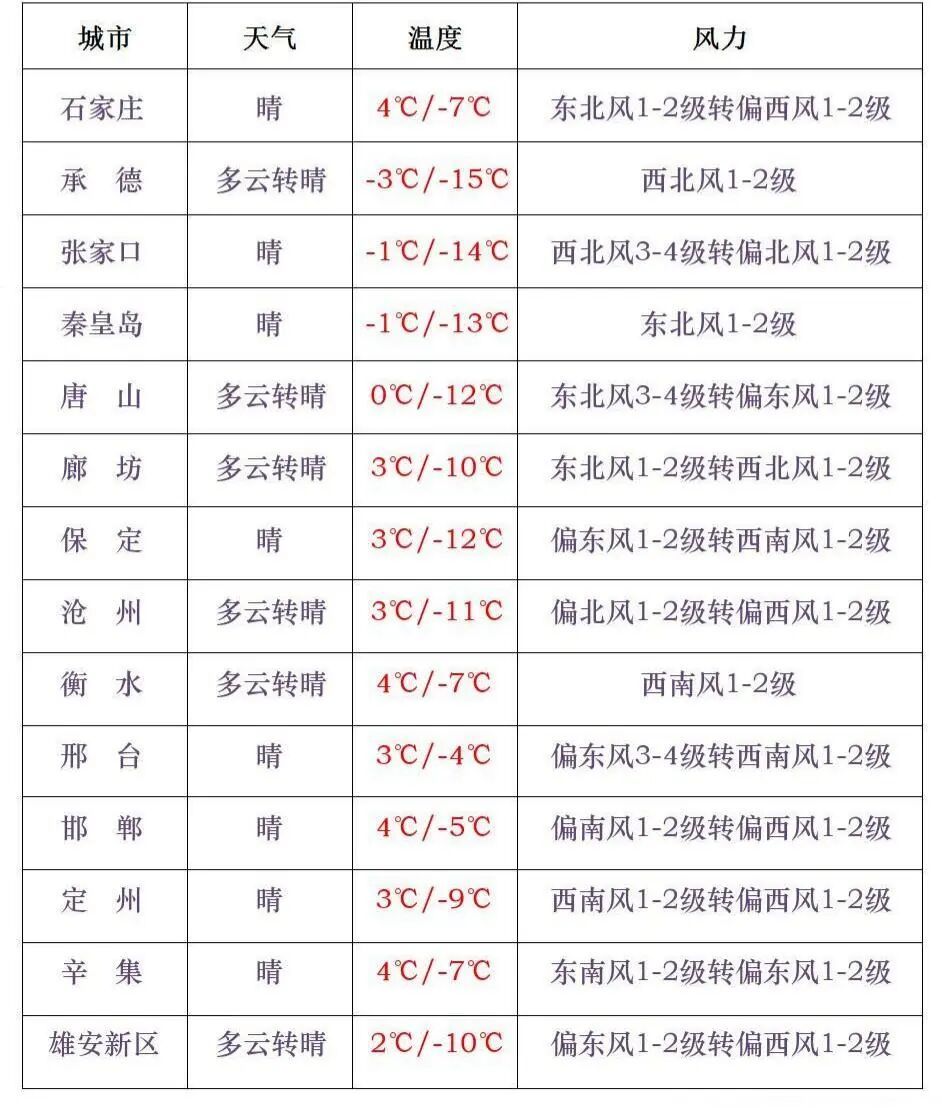【河北跨年迎风雪】受寒潮影响,新年第一天,我省多地最低温低于-10°C,其中邯郸西南部有零星小雪或小雪;张家口东部、承德北部风力较大。石家庄晴,-7~4°C;雄安新区多云转晴,-10~2°C;北京多云转晴,-8~1°C。