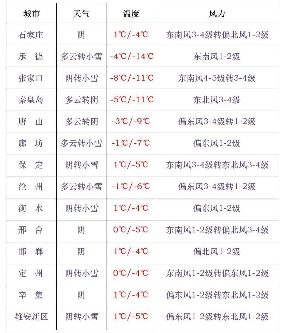 【本轮雨雪有多强】1月16日至22日,河北省有两次冷空气过程,气温持续偏低,尤其白天最高气温较历史同期明显偏低(偏低8~10℃),体感寒冷。19到20日,全省大部分地区最低气温下降4~7℃,北部和东部地区下降8~12℃。石家庄阴,-4~1°C;雄安新区阴转小雪,-5~1°C;北京多云转小雪,-6~-1°C。