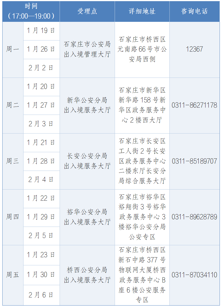 【启动夜间专场】1月19日至2月6日,石家庄公安出入境管理部门启动中国公民出入境办证夜间专场,市内5个受理点共开设15场夜间专场,统一延时开放至19:00。