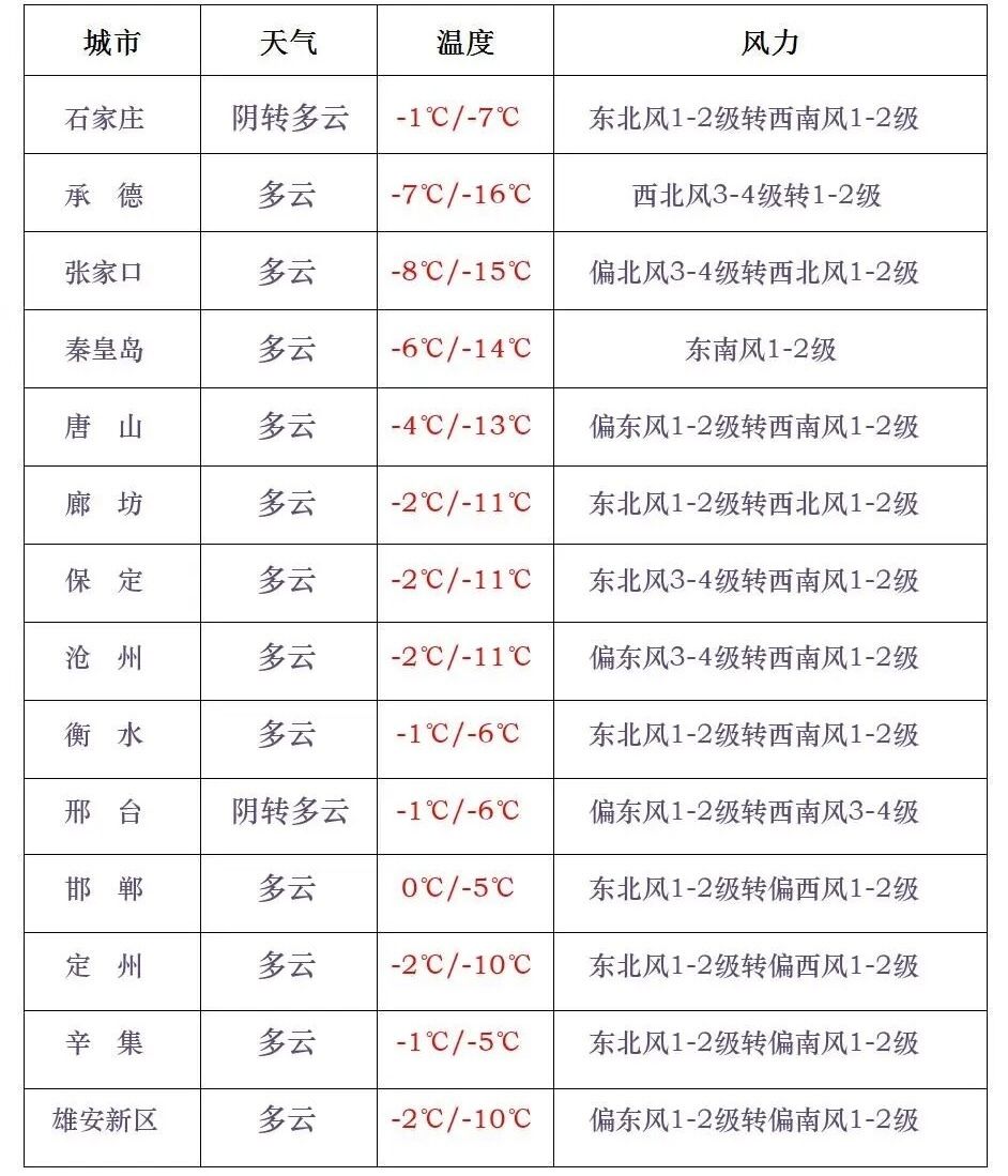 【继续发布寒潮预警】河北省气象台继续发布寒潮蓝色预警信号:受冷空气影响,今天,张家口、承德、秦皇岛北部、保定西北部最低气温降至-22~-13℃,其中坝上地区降至-32~-23℃,其他地区降至-12~-4℃;最高气温全省大部分地区降至0℃以下。今天白天,全省多云间阴,其中张家口西南部和保定、石家庄、邢台、邯郸四个地区的西部有零星小雪或小雪。