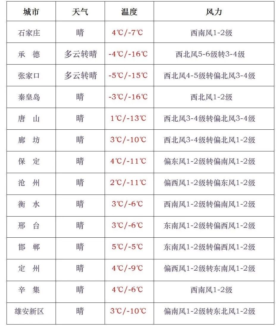 【会一直冷到春节吗】今天早晨,全省大部分地区最低气温继续下降2~4℃。今天白天,保定、廊坊以北地区多云转晴,其他地区晴间多云,张家口、承德、保定西北部有西北风4到6级,阵风7到8级。
