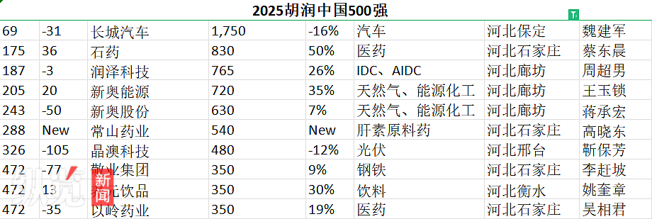 【河北10家企业上榜500强】胡润研究院2月5日发布《2025胡润中国500强》榜单,列出了中国500强非国有企业。河北有10家企业上榜,长城汽车以1750亿元的价值位列第69,为河北上榜企业首位。