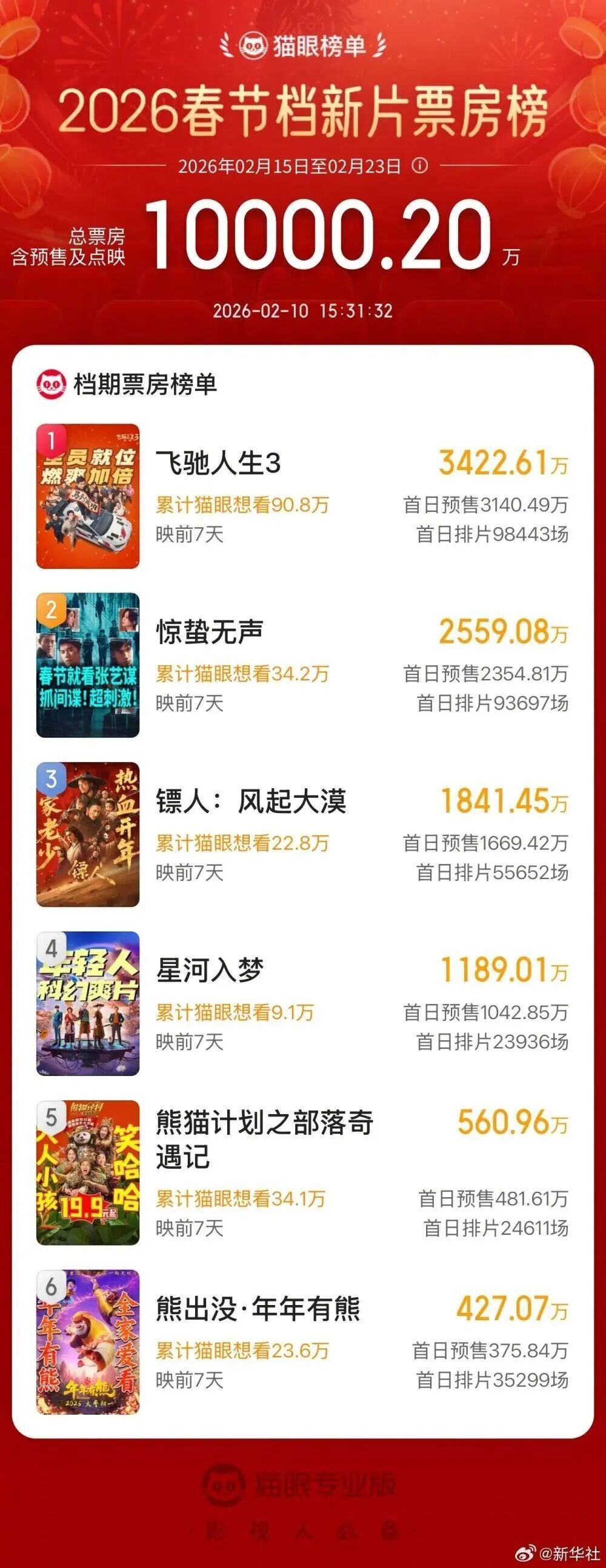 【“史上最长春节档”电影片单发布】2026春节档电影片单2月9日在京发布,影片种类涵盖喜剧、动作、动画、科幻等类型。据平台数据显示,2026年春节档新片预售总票房已破亿,《飞驰人生3》《惊蛰无声》《镖人:风起大漠》分列前三。