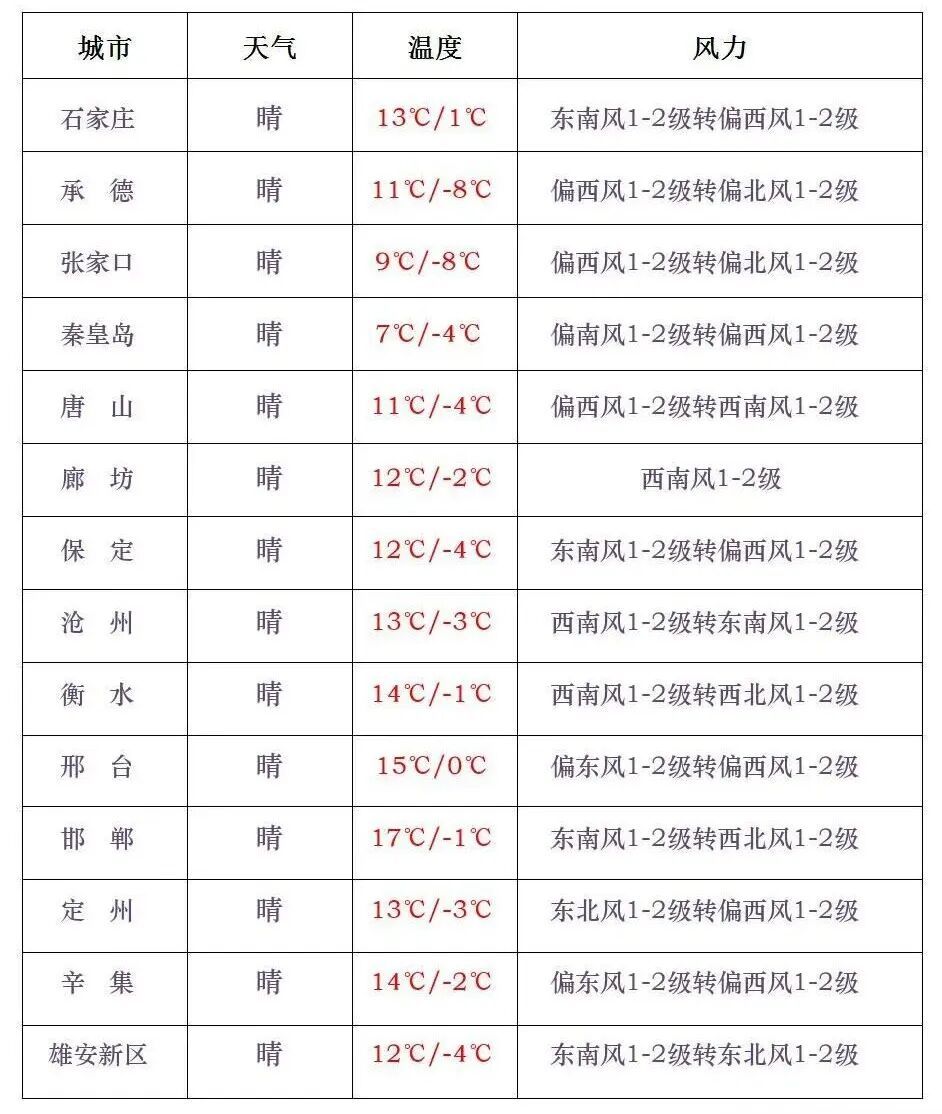【最高冲击20℃】2月11日至14日,我国大部地区开启一轮超猛的大回暖,从东北到江南,多地气温将创今年以来新高。北方气温的高点将出现在13日前后,石家庄最高气温或将达到19℃,邯郸最高气温有望达到20℃。今天(2月12日),石家庄晴,1~13°C;雄安新区晴,-4~12°C;北京晴,-2~11°C。
