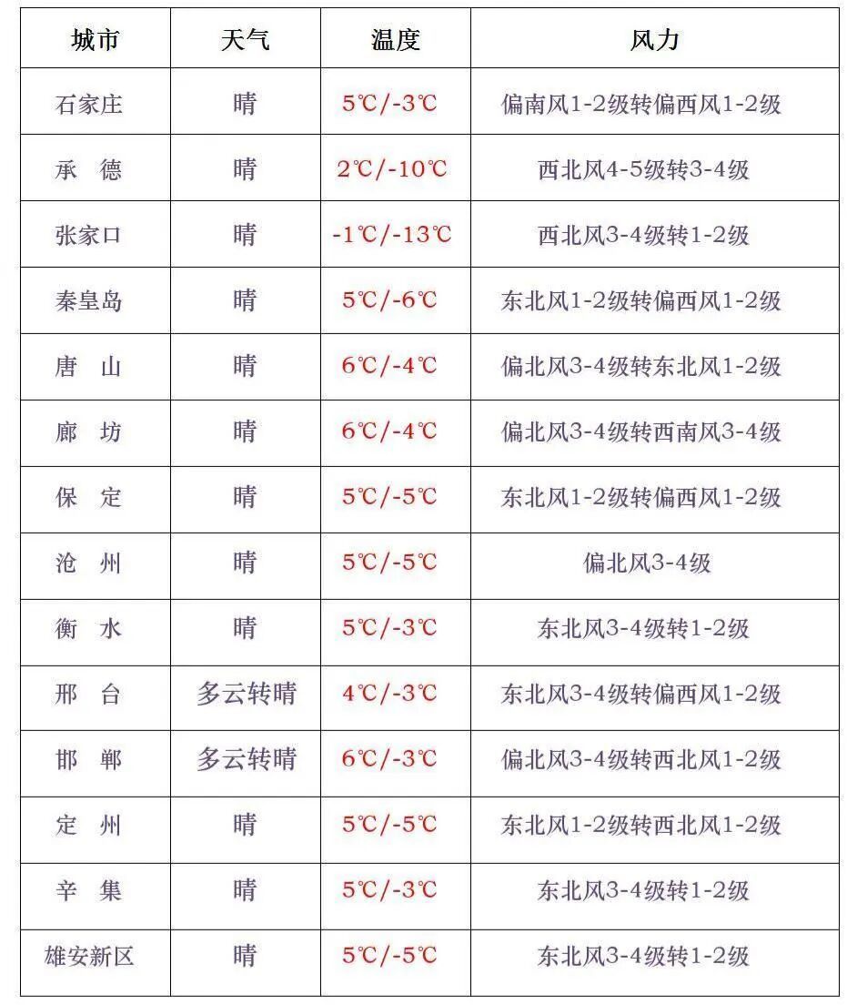 【气温“大跳水”】15-16日早晨,北部和东部地区最低气温下降5~8℃,其中张家口北部和承德坝上地区下降9~11℃,其他地区最低气温下降2~4℃。石家庄晴,-3~5°C;雄安新区晴,-5~5°C;北京晴,-4~6°C。