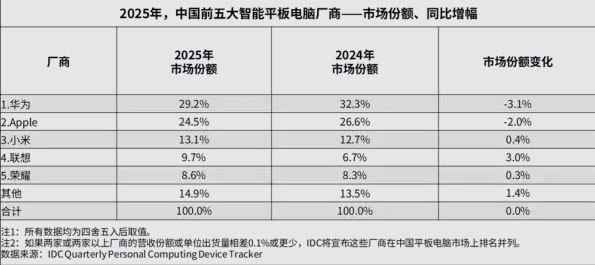 【华为蝉联第一,苹果份额连跌】国际数据公司(IDC)近日数据显示,2025年中国平板电脑市场出货量为3376万台,同比增长13.1%。2025年全年,出货量排名前五的厂商分别为华为(29.2%)、苹果(24.5%)、小米(13.1%)、联想(9.7%)、荣耀(8.6%),华为蝉联第一名。相比2024年,华为市场份额下滑3.1个百分点,但仍比2023年要高,而苹果市占率出现连续下滑,相比2023年的33.6%下滑了近10个百分点。