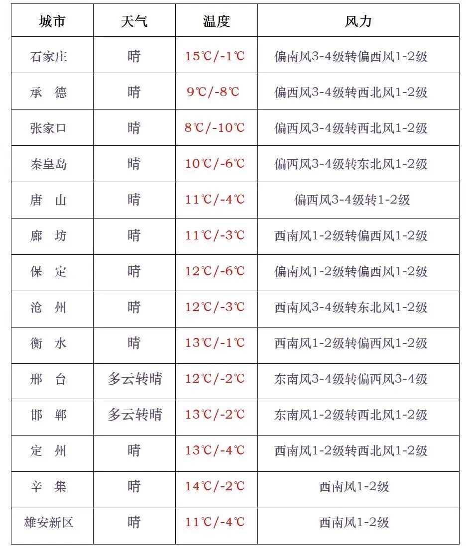【气温回升】未来两天,我省大部分地区以晴到多云天气为主,今天开始气温有所回升。今天白天,张家口北部、承德北部晴转多云,其他地区晴间多云,张家口、承德北部、保定西北部有西北风4到5级,阵风6到7级,局地可达8级。