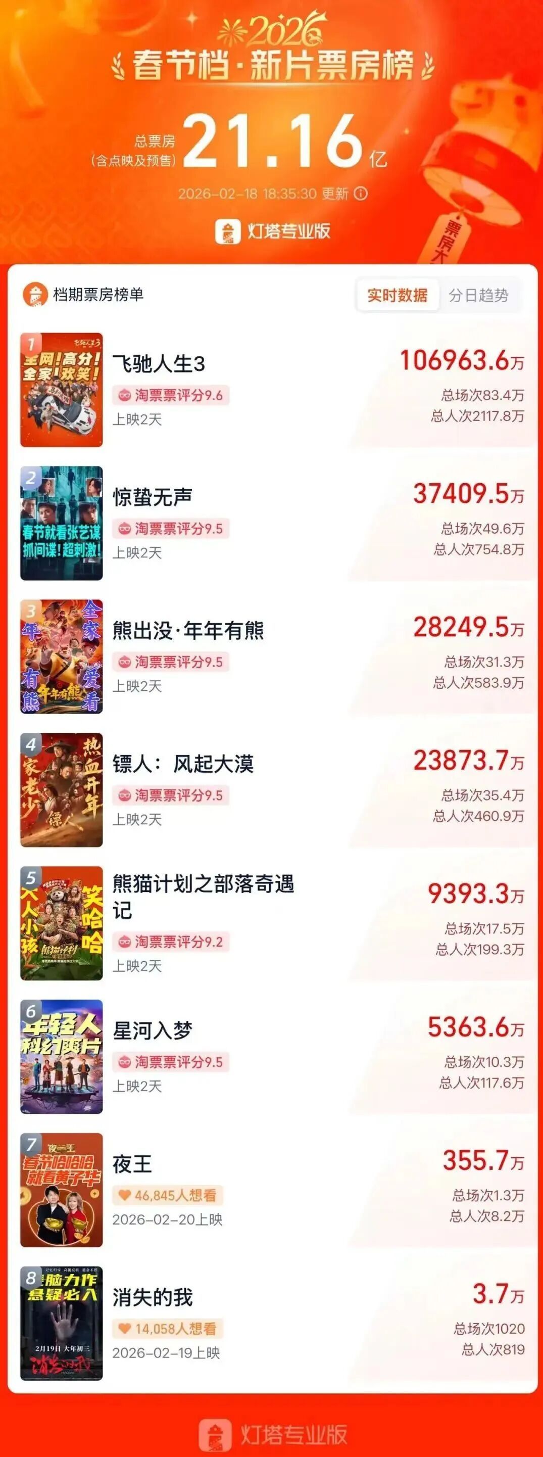 【春节档总票房破20亿】2月18日,据网络平台数据,2026年春节档电影总票房(含预售)已突破20亿元!其中,《飞驰人生3》档期票房突破10亿(含预售),领跑春节档票房榜,贡献大盘五成票房。猫眼专业版预测其总票房有望突破50亿元。