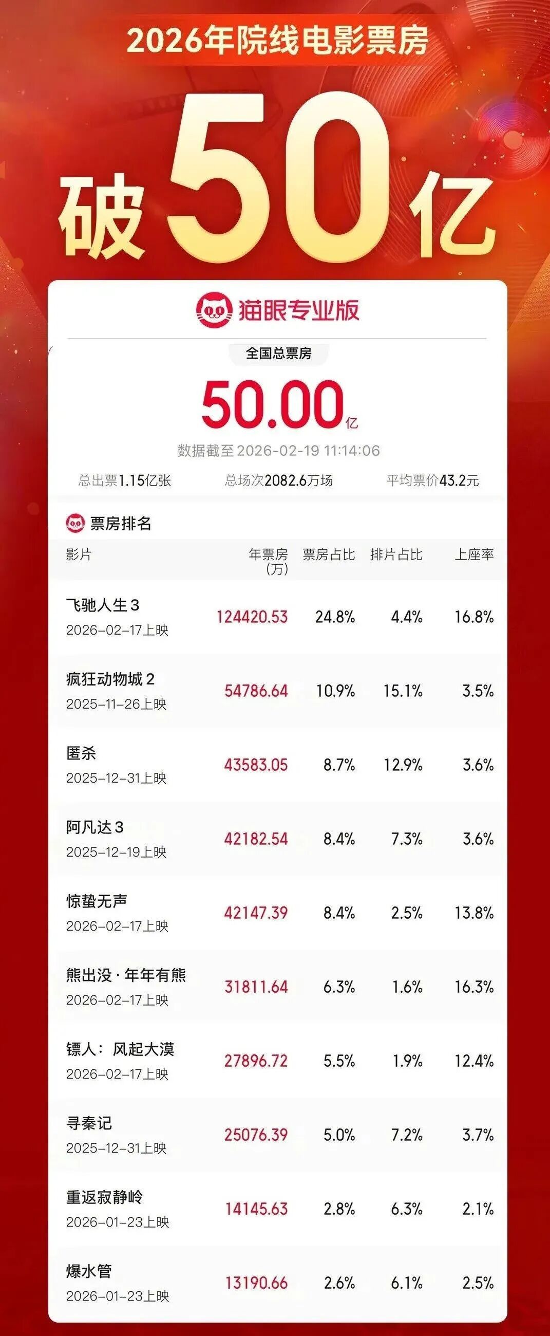 【已破50亿】据网络平台数据,截至2月19日11时14分,2026年年度电影总票房(含预售)突破50亿,《飞驰人生3》《疯狂动物城2》《匿杀》《阿凡达3》《惊蛰无声》暂列前5位。