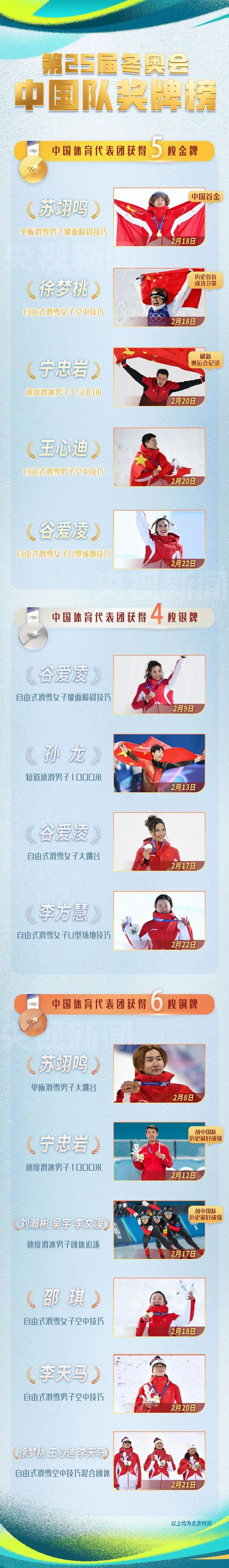 【中国队创历史】中国队在本届冬奥会取得5金4银6铜共15枚奖牌,创造境外参加冬奥会的最佳战绩。中国队选手谷爱凌在两届冬奥会共收获3金3银,成为奥运史上获得奖牌最多的自由式滑雪运动员。谷爱凌夺金后刷新多项纪录>>(请上下滑动查看图片)