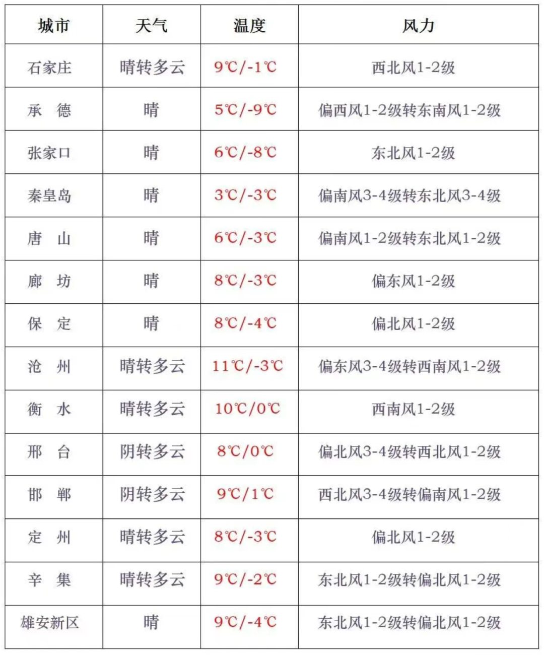 【天气】今天(2月23日)早晨,全省大部分地区最低气温继续下降2~5℃,其中保定南部、石家庄、沧州西部、衡水、邢台、邯郸下降6~8℃,局地下降10℃。最低气温,张家口北部、承德北部降至-25~-15℃,其他地区降至-14~3℃。今天白天,邢台、邯郸多云间阴,其中邯郸南部有小雨或零星小雨,其他地区晴间多云。石家庄,晴转多云,-1~9℃;雄安新区,晴,-4~9℃;北京,晴转多云,-3~6℃。