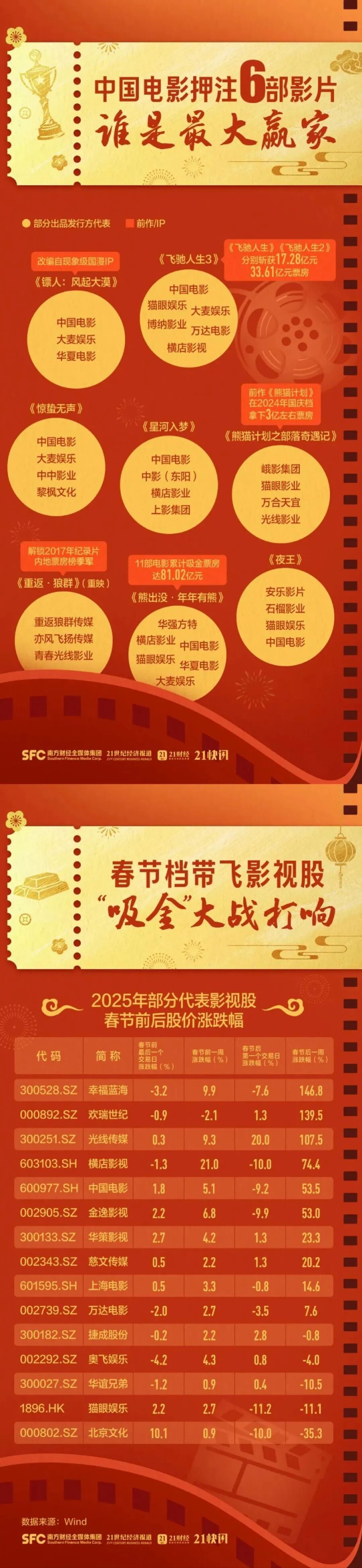 【谁是春节档最大赢家】据猫眼专业版数据,截至2月22日18时,2026年春节档档期总票房(含预售)破50亿,《飞驰人生3》《镖人:风起大漠》《惊蛰无声》分列前三位。随着《飞驰人生3》的热映,演员沈腾有望凭本片成为首位主演电影票房破400亿元的演员。2026年春节档,多部影片背后有上市影企参与,包括光线传媒、中国电影、横店影视、博纳影业等多家上市公司。春节档热门影片背后有哪些影视资本押注>>(请上下滑动查看图片)
