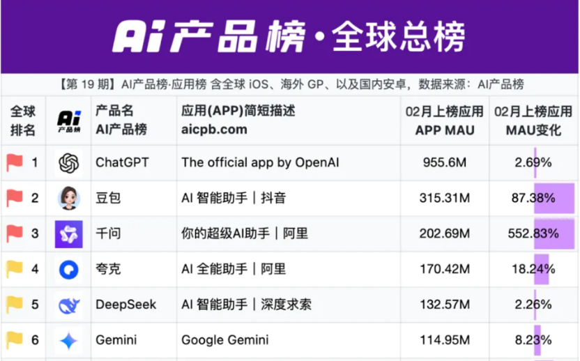 【千问成全球第三大AI应用】AI产品榜3月3日发布的全球AI应用最新数据显示,MAU(月活用户数)排名前三的AI应用分别为ChatGPT、豆包和千问,其中,千问以2.03亿MAU成为全球第三大AI应用,并以552%的增速居全球第一。春节期间,1.3亿用户在千问“一句话下单”累计超2亿次,相当于全国平均每10人就有1人在千问下单,千问由此一跃成为国民级AI助手。