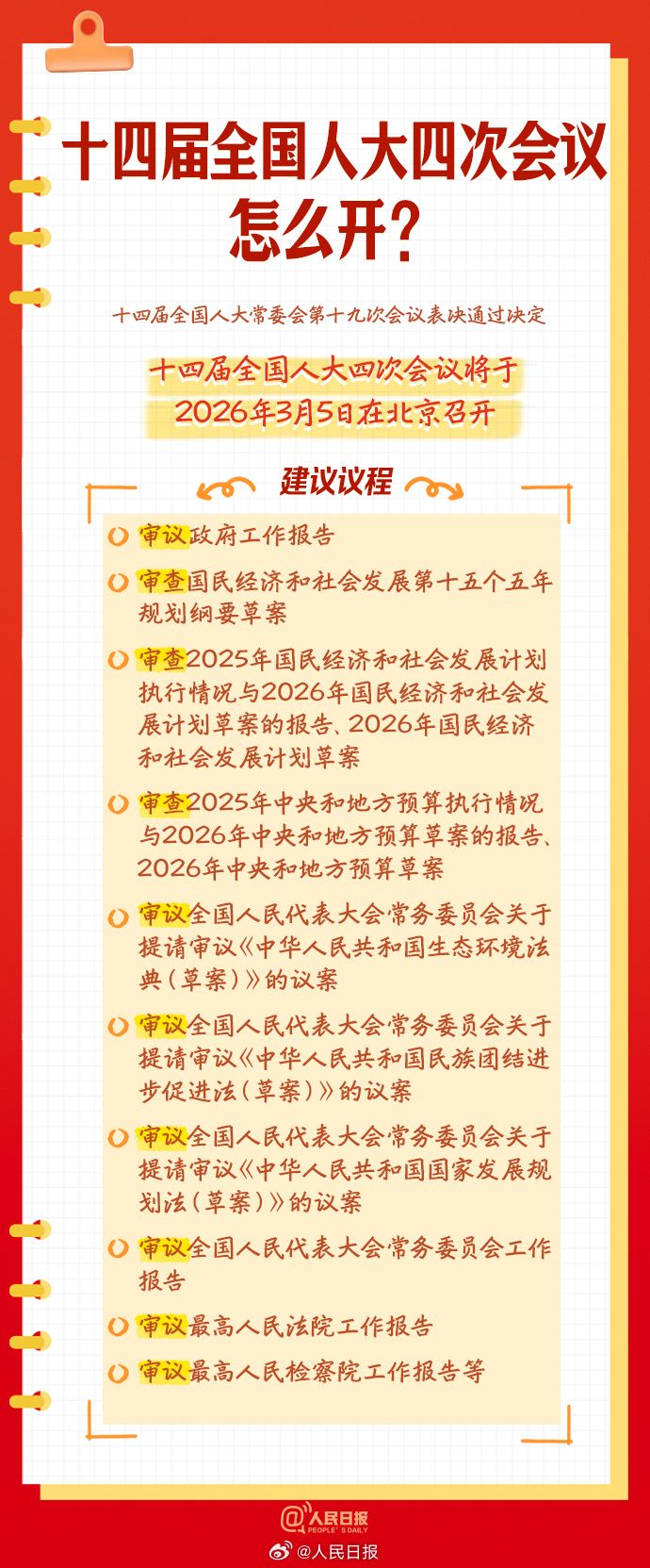 【9图了解人大知识点】十四届全国人大四次会议将于3月4日(星期三)12时在人民大会堂新闻发布厅举行新闻发布会,由大会发言人就大会议程和人大工作相关问题回答中外记者提问。全国人民代表大会是什么?将决定哪些国家重大事项?人大代表怎么产生?9图了解人大知识点↓↓(请上下滑动查看图片)
