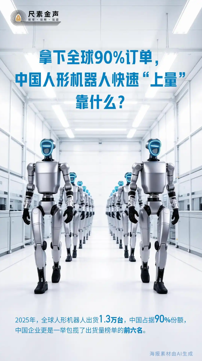 【中国人形机器人拿下全球90%订单】2025年,全球人形机器人出货1.3万台,中国占据90%份额,中国企业更是一举包揽了出货量榜单的前六名。人民日报指出,驱动中国人形机器人“上量”的优势在于价格以及超大规模市场和丰富多元的应用场景。由于中国的制造业供应链体系优势,以及配套企业相继突破关键核心技术,国内人形机器人核心零部件成本只有国外的1/3甚至更低。