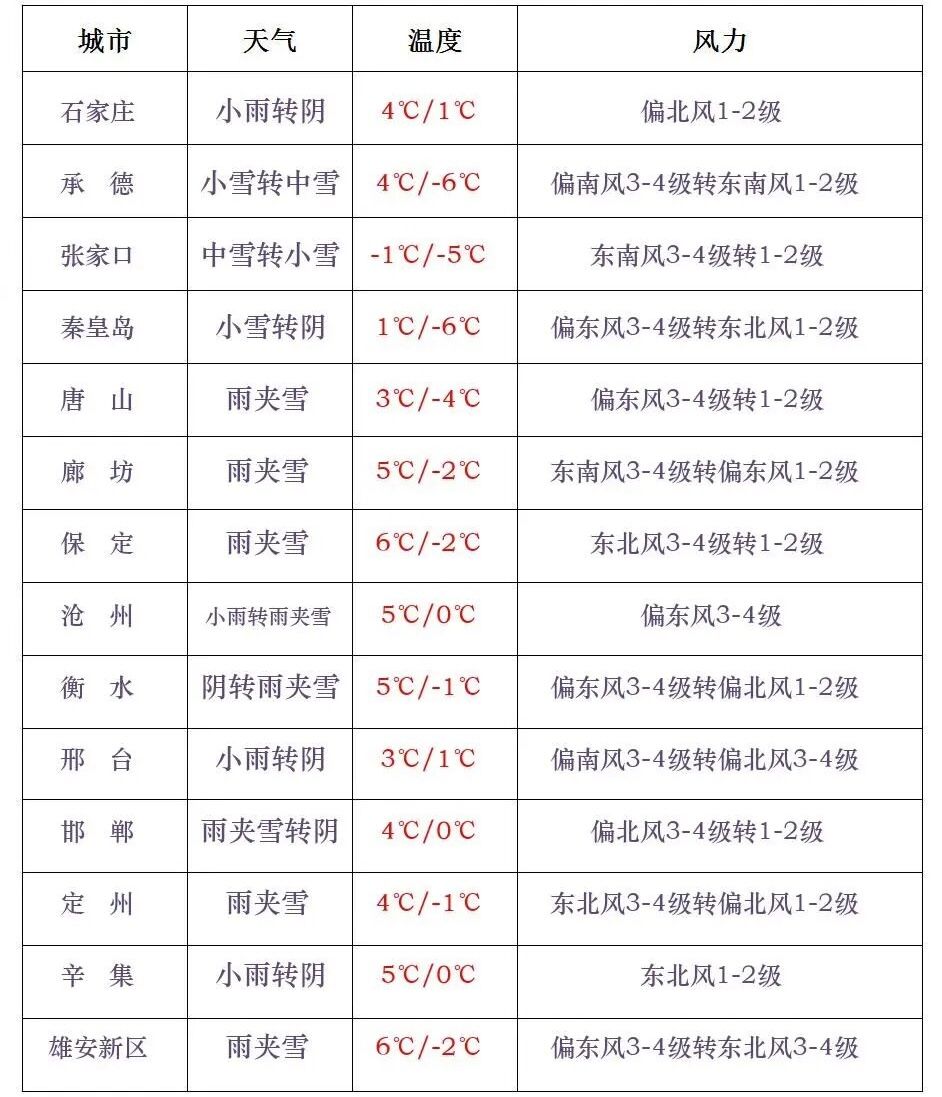 【风雪又来】今天白天,全省多云转阴,石家庄、沧州以北地区和邢台西部、邯郸西部有小雪,部分地区有中雪,其他地区有雨夹雪或小雨。今天夜间到明天,保定、廊坊及以北地区阴有小雪转多云,部分地区有中雪,局地有大雪,石家庄中南部、衡水南部、邢台、邯郸阴转多云,其他地区阴有雨夹雪或小雪转多云。今天早晨,张家口东部、承德北部最低气温下降3~5℃,局地下降6~8℃。