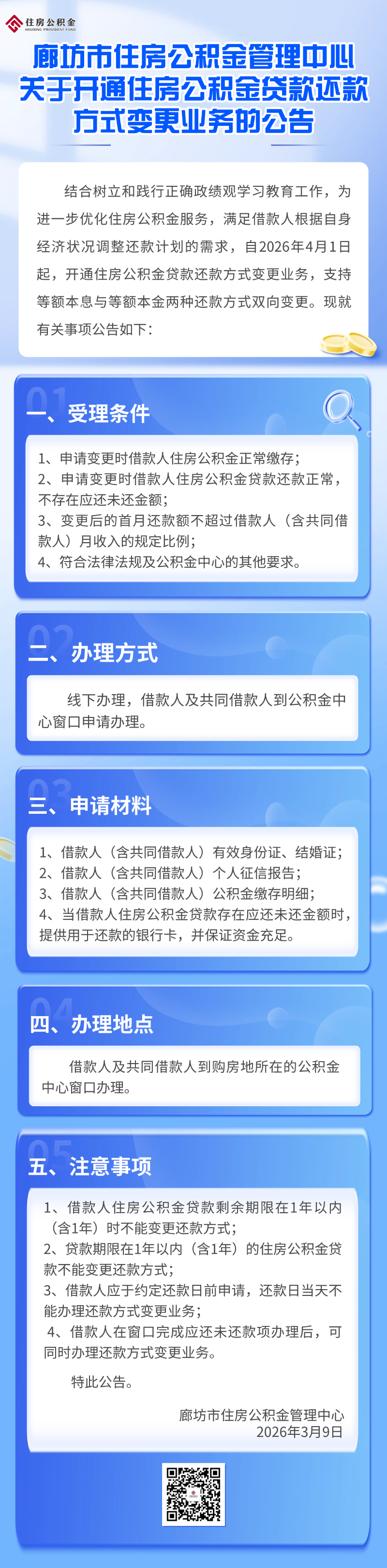 【公积金贷款还款方式可变更】自4月1日起,廊坊市开通住房公积金贷款还款方式变更业务,支持等额本息与等额本金两种还款方式双向变更。(请上下滑动查看图片)